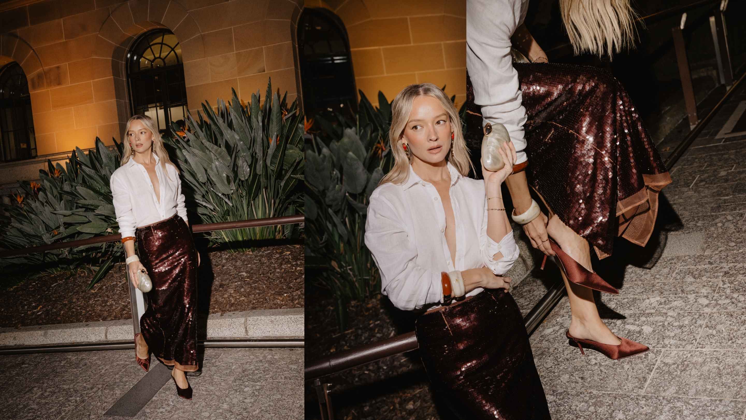 Emma Chen, Brisbane’s go-to makeup artist and trendsetter redefined androgyny, balancing a menswear linen shirt from Zara with a moody sequin skirt from Sheike and satin heels.