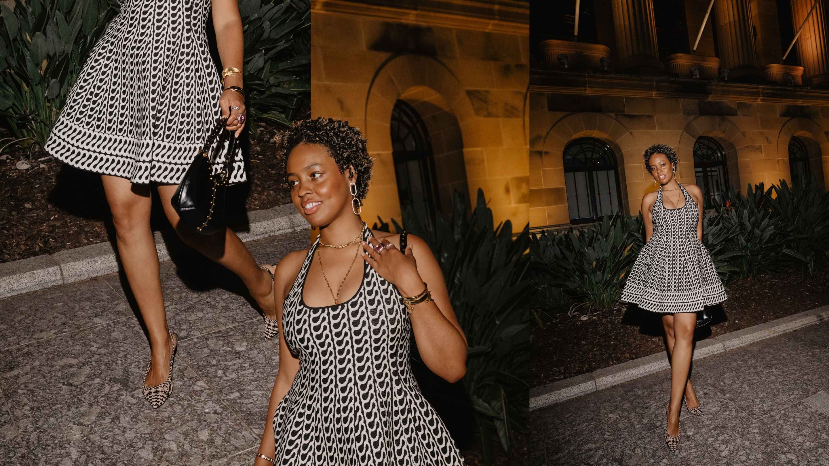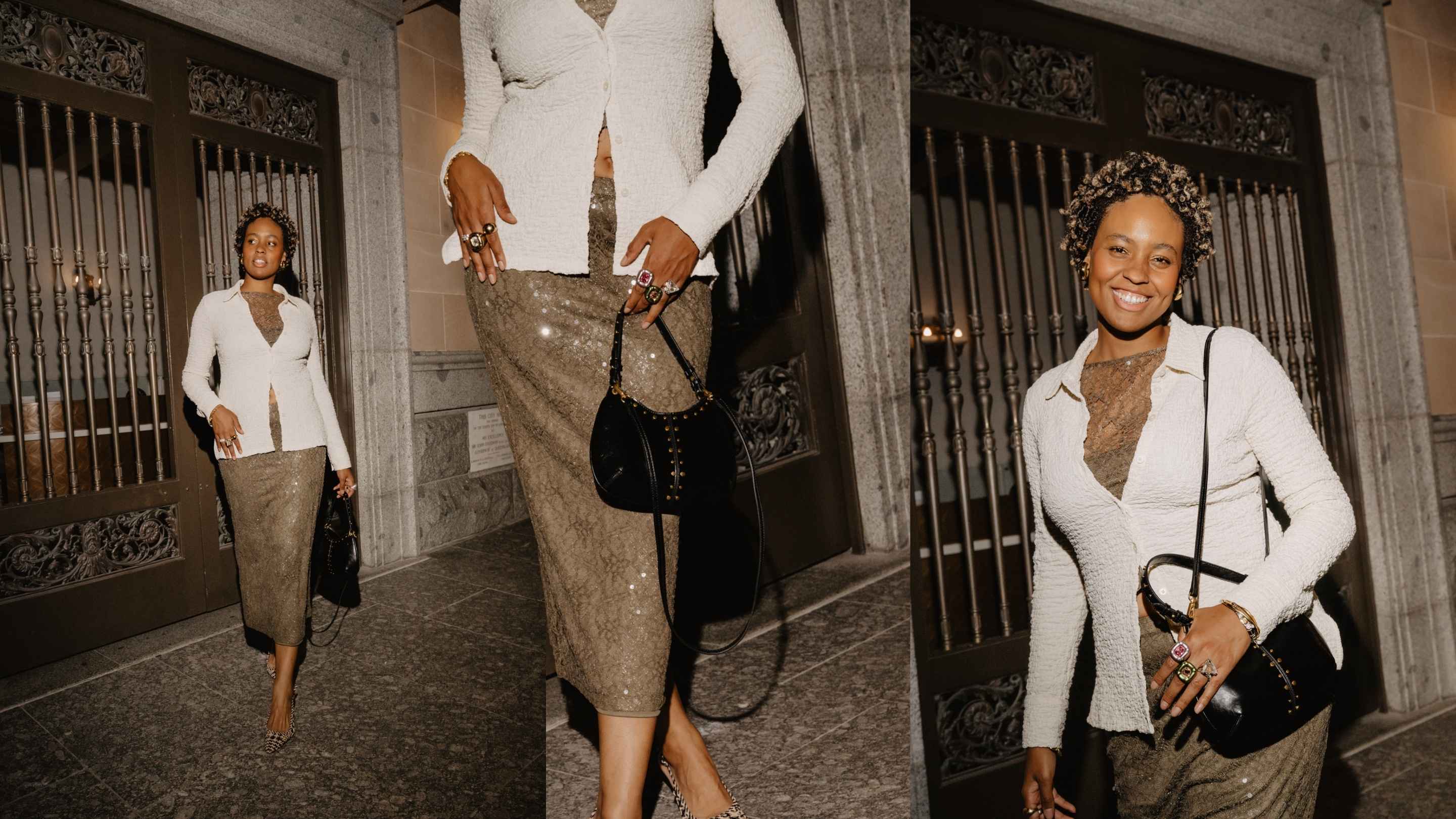 Aicha Robertson, a rising movie-and-TV girlie who turned heads with not one but two festival looks. First, she played with proportion in a voluminous mini silhouette from Sheike. Later, she showcased sequins with elegance, balancing sparkle in a refined pairing of Zara and Nine West.